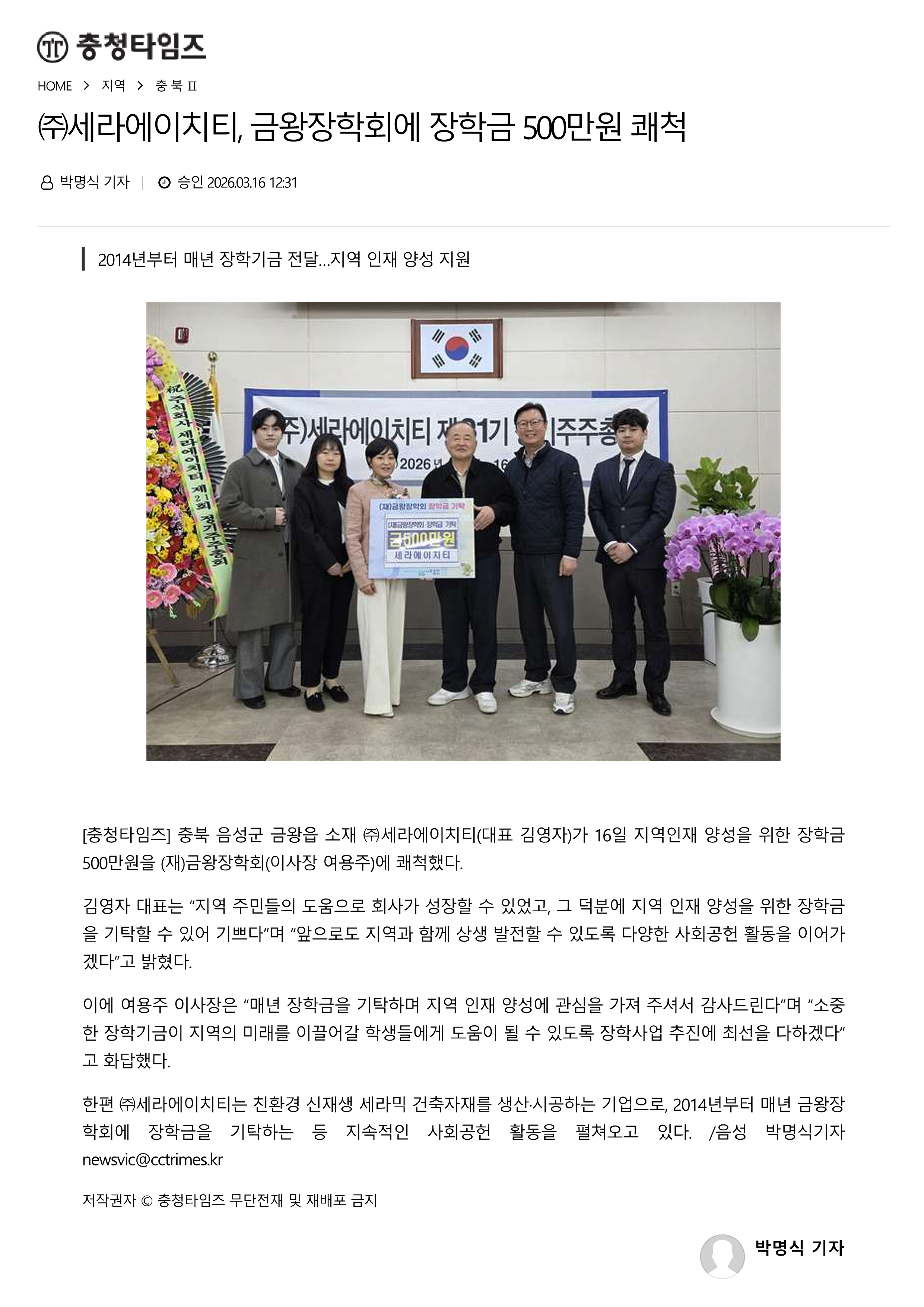 | [충청타임즈] ㈜세라에이치티, 금왕장학회에 장학금 500만원 쾌척 |