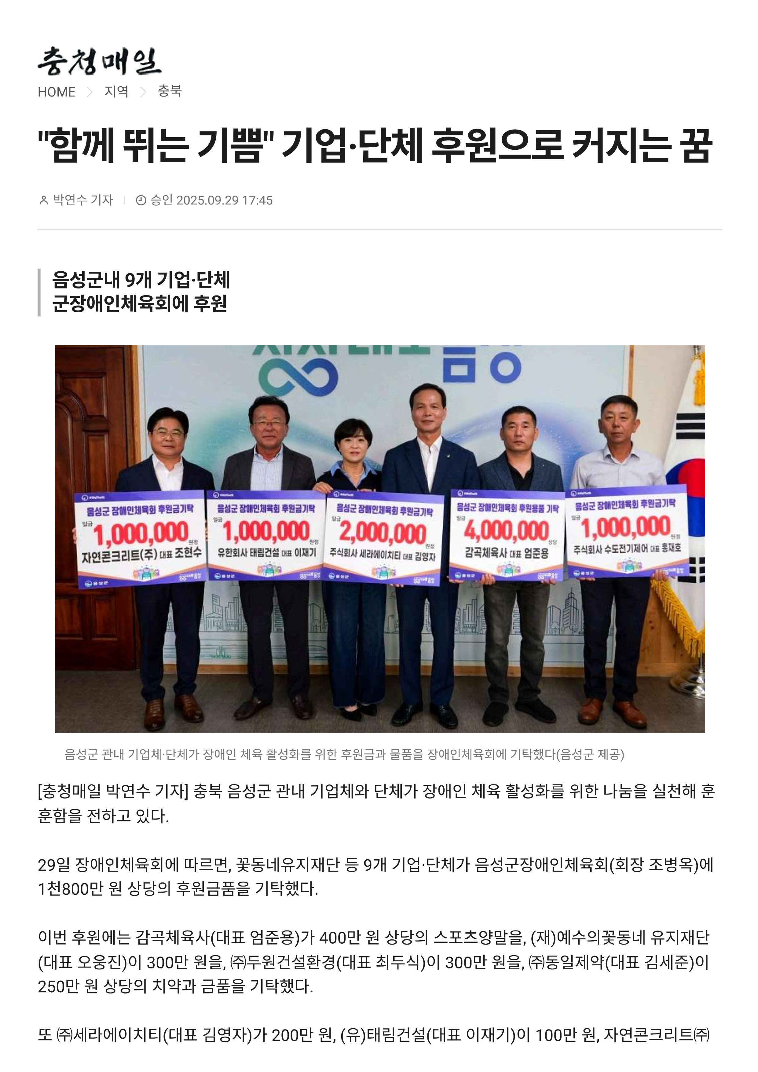 | [충청매일] "함께 뛰는 기쁨" 기업⋅단체 후원으로 커지는 꿈 |