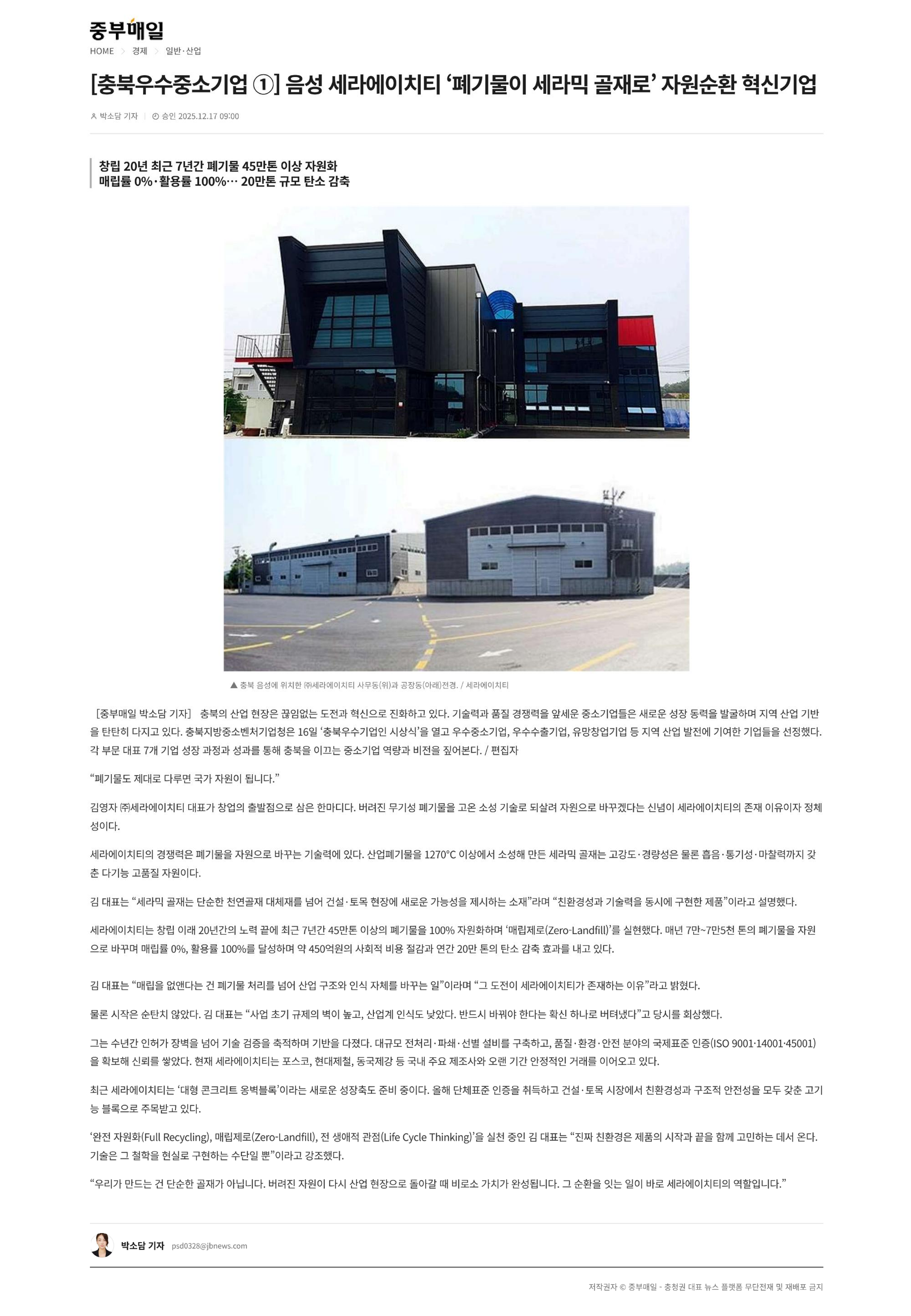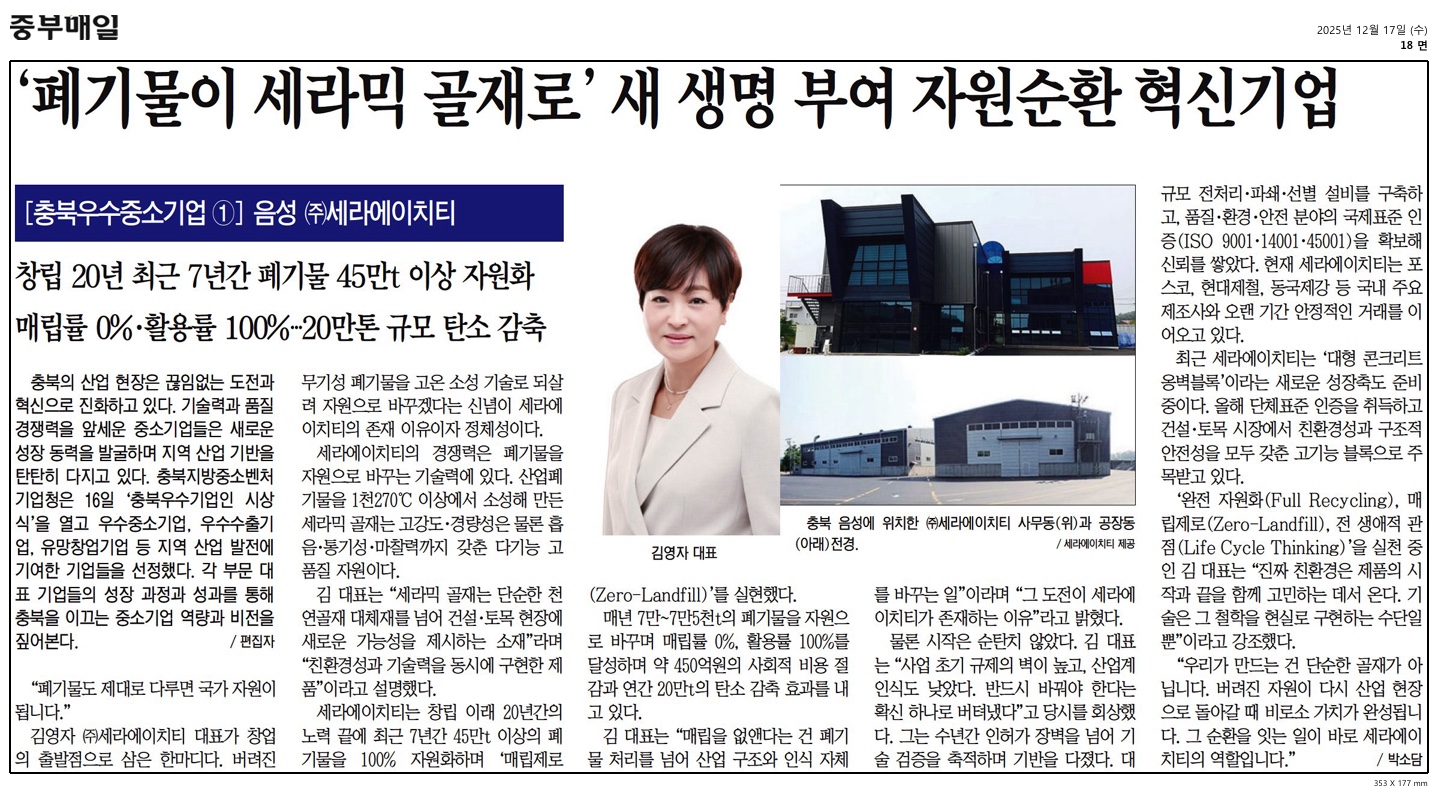 | [중부매일] 음성 주식회사 세라에이치티 '폐기물이 세라믹 골재로' 자원순환 혁신기업 |